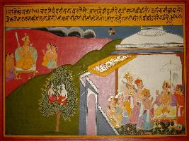 | Description / विवरण | Miniature painting based on Prithviraj Raso depicting Kavi Chandvardai explaining about court of Jaichand. He compared his court with the court of Indra. |
