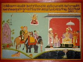 | Description / विवरण | Miniature painting based on Prithviraj Raso depicting Kavi Chandvardai praising the procession of king Jaichand. He is saying that the movement of procession seems as earth and mountains are moving. The glory of other kings are diminishing in front of glory of Jaichand as light of lamp diminishes when heavy air blows. |