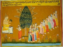 | Description / विवरण | Miniature painting based on Kashi khand depicting rishi are first created by Brahma. Then he created other world. A rishi is shown with folded hand in front of Brahma. At right part rishi is taking a leave. Saptarishi is shown leaving and behind them women is shown following them at left part. |