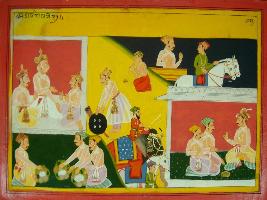 | Description / विवरण | Miniature painting based on Mahabharat - Vana parva depicting Bhishma is sitting with Yudhisthir and Duryodhan. In other parts, Pandavas, depicted eating food. |