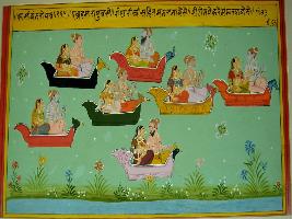 | Description / विवरण | Miniature painting based on Kashi khand depicting seven sons of Brahma going to Mandala for penance with their wife in their personal yaan. |
