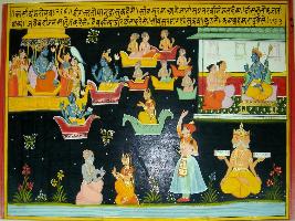 | Description / विवरण | Miniature painting based on Kashi khand depicting visit of Shivsharma to Vishnu lok. Shivsharma is going to meet Vishnu with Saptarishi. At the upper left two devotees are praying to Vishnu. Vishnu is depicted going in his yaan and Devkanya is praying to him. At the lower panel, Shivsharma is sited with Devkanya, to its left their son is depicted. At the lower left Brahma is shown. |