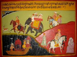 | Description / विवरण | Miniature painting based on Prithviraj Raso depicting poet Chandvardai telling Jaichand that Kurangvat fleeing in fear of Jaichand in the way light sends away the darkness. |