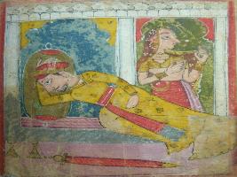 | Description / विवरण | A leaf of illustrated manuscript based on Chandra Kumar ki chaupai depicting a noble sleeping on bed with female standing besides him. This manuscript has 12 illustration. |