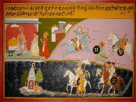 | Description / विवरण | Miniature painting based on Prithviraj Raso depicting Kavi Chandvardai talking to king Jaichand. In upper left part a fighting scene is depicted and in lower left part, a king moving towards temple is depicted. |