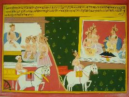 | Description / विवरण | Miniature painting based on Mahabharat - Vana parva depicting Yudhisthir and other Pandavas reached Hanstinupur with Vidur and asked Dhirtrastra for Justice. Duryodhan ask Pandavas to go back to forest. |