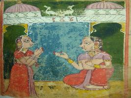 | Description / विवरण | A leaf of illustrated manuscript on Chandra Kumar ki chaupai depicting a female sitting and another female standing in front of her with folded hands. This manuscript has 12 illustration. |