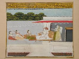 | Description / विवरण | Raj Deepak ragmala paintings is shown. Where king is sitting in the courtyard. A female attendant is holding a chauri standing behind the king. Three female musicians are playing music in front of king. White fence is shown in the foreground with red flowers in both the sides. A grey wall is shown in the background with hidden trees. Some script in Sanskrit is wirtten on the top of the miniature painting. |