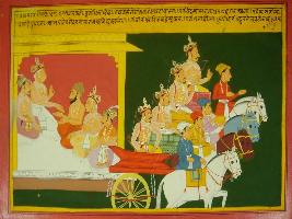 | Description / विवरण | Miniature painting based on Mahabharat - Vana parva depicting Duryodhan moves with his friends to kill Pandavas. Mean while, sage Vyas is coming to Dhritrashtra and told that after 13 years a great war will be going to occur between Kaurvas and Pandavas. |