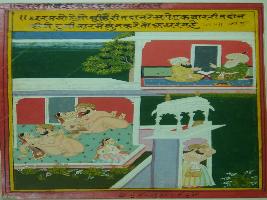 | Description / विवरण | Miniature painting based on Mullah-do-Piyaja. It depicts that one should have loving union with his her lover, only once in a day and twice is a sin and Adharma. |