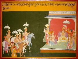 | Description / विवरण | Miniature painting based on Prithviraj Raso depicting poet Chandvardai talking to Jaichand and making him aware of his genealogical decendancy and his glorious part. |