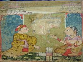 | Description / विवरण | A leaf of illustrated manuscript based on Chandra Kumar ki chaupai depicting a noble man sitting and playing chaupar with his wife. This manuscript has 12 illustration. |