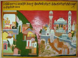 | Description / विवरण | Miniature painting based on Prithviraj Raso depicting Maharaja Jaichand and poet Chandvardai where Chandvardai says to Jaichand that Prithviraj is an indefeasible king. On the painting Prithviraj is also seen followed by two attendants at his palatial balcony. |