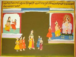 | Description / विवरण | Miniature painting based on Kashi khand depicting a mother and her child in upper right corner and centre. The painting says that though a child makes several mistakes with his mother, the mother cannot cross them all one equal to her. In the right side Surya is seen. |
