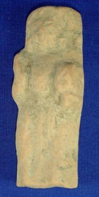 | Description / विवरण | Terracotta male deity in standing position. His feet are broken. His right hand is in Abhaya mudra and left hand holding something. He is wearing a drapery, folds of which are slightly visible. Earthly incrustation is seen all over the figure. |