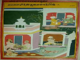 | Description / विवरण | Miniature painting depicting Mullah-do-Piyaja telling a man who lived in house of his wife is compared to a dog. |