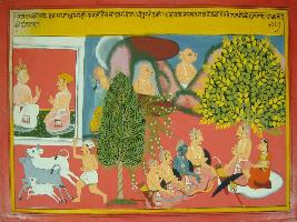 | Description / विवरण | Miniature painting based on Mahabharat - Vana parva depicting Dhritrashtra asking Vidur about Karmi demon. It also depicts Pandavas reaches kamyak vana where no one either sage or gopas. |