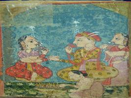 | Description / विवरण | A leaf of illustrated manuscript based on Chandra Kumar ki chaupai depicting a couple seated with holding each other s hand and an attendant is standing behind the male. In lower part, a Brahman is depicted performing yagna. This manuscript has 12 illustrations. |