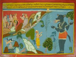 | Description / विवरण | Miniature painting based on Mahabharat - Vana parva depicting Pandavas in Kamyak vana depicting the massive and dangerous form of demon Dhaumya sage come to help Pandavas. |