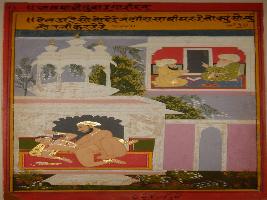 | Description / विवरण | Miniature painting depicting Akbar and Mullah-do-Piyaja talking on the lower part a couple is depicted doing sex. |