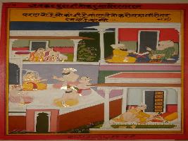 | Description / विवरण | Miniature painting depicting Akbar and Mullah-do-Piyaja talking. On the lower part marriage scene and the newly wedded couple is depicted mating. |