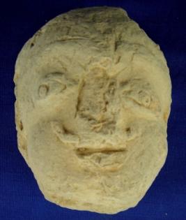 | Description / विवरण | Terracotta male head having a moustache, open eyes and open mouth. His nose and head are mutilated. |