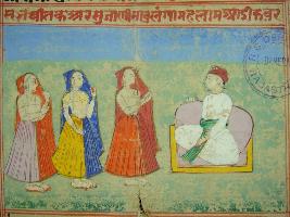 | Description / विवरण | A leaf of illustrated manuscript depicting three women talking to a man sitting on a couch. This Manuscript has 38 pages with 16 illustrations. |