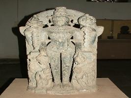 | Description / विवरण | A four armed God Vishnu is shown in standing with his attributes Sanmkha, Chacra Gada and Axamala in four one. Atthye each side two male and female attendants areshown at left and right corner. |