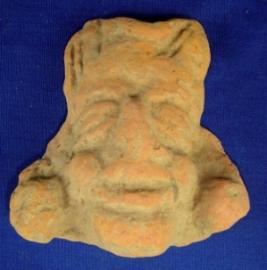 | Description / विवरण | Terracotta male head wearing a turban and round earrings. He has bulging eyes, open mouth and plump checks. But the facial features are slightly rubbed off. |