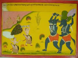| Description / विवरण | Miniature painting based on Mahabharat - Vana parva depicting fight between demon Karmakari and Bhim with tree and rocks as their weapons. |
