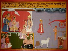 | Description / विवरण | Miniature painting based on Prithviraj Raso. A king is depicted sitting on a throne surrounded by courtiers in the palace. Outside the palace, there is depiction of a farmer, cow and water lifting machine and a rich man saying something to the farmer. |