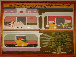 | Description / विवरण | Miniature painting depicting Akbar and Mullah-do-Piyaja talking and a man is depicted mating with his wife on the lower part a man is depicted sitting alone on the Veranda of a house. |