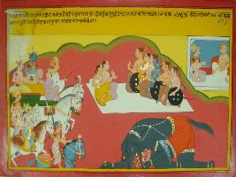 | Description / विवरण | Miniature painting based on Mahabharat - Vana parva depicting Bhuna killed demon Karmakari after vigorous fight. Then different warriors like Satyiki, Dhristadyumana and king of Kaikeya state come to Pandavas. Krishna also arrives and criticises Duryodhan. |