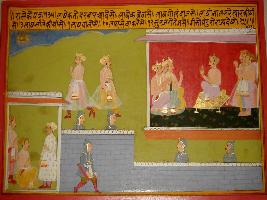 | Description / विवरण | Miniature painting based on Prithviraj Raso depicting the court of a king where the king is sitting on the throne. Then a man, Lakhek comes to visit him. On the other part of the painting five soldiers are seen guarding the palace. |
