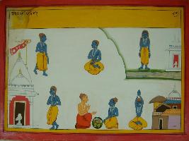 | Description / विवरण | Miniature painting based on Mahabharat - Vana parva depicting Arjun in various yogic postures, praying to Shiv. |