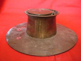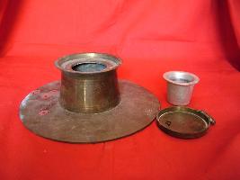 | Description / विवरण | It is an inkpot with flat and circular base and a cylindrical body with a lid, fixed by a clamp. The ink container is fixed by a groove. |