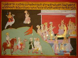 | Description / विवरण | Miniature painting based on Prithviraj Raso depicting the court of Jaichand. The painting depicts Chandvardai coming to meet Jaichand while Saraswati is seen sitting on her vehicle in the right up corner. |