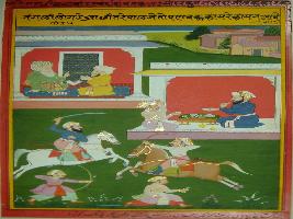 | Description / विवरण | Miniature painting depicting Akbar and Mullah-do-Piyaja talking. On the lower part two men are depicted having food, two men fighting and one man giving an arrow and holding on the other hand a broken sword. |