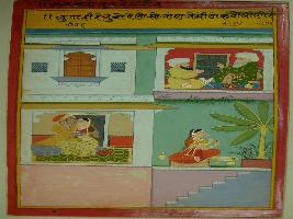 | Description / विवरण | Miniature painting depicting Mullah-do-Piyaja, courtesans telling Akbar that kiss of husband to his wife look like sweet kabab to wife. |