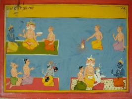| Description / विवरण | Miniature painting based on Mahabharat - Vana parva depicting Krishna talking to Brahma on upper right part. On upper left part, 2 yogis are performing yagna. In lower right part, a dev purush and a Danav are talking to Narad muni and in lower left part, Brahma, Shiv and a dev purush are talking to Krishna. |