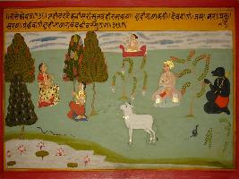 | Description / विवरण | Miniature painting based on Prithviraj Raso depicting Chandvardai telling about devbani , snakes, beasts, yakshas and human being. |