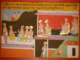 | Description / विवरण | Miniature painting based on Prithviraj Raso depicting Raja Jaichand asking to his poet Sarangsu about Indra and a story of a man fixed in the house. |