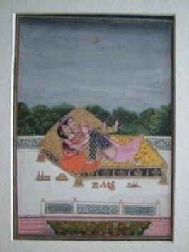 | Description / विवरण | The painting depicts a couple, having sex on the bed Palang . The man is on top and lady is under him. In the background, there is the blue, black sky with full moon, trees and the house upon which both are having sex. The color of the carpet is yellow upon which designs are made in a floral manner in red & blue color. Their strips made in floral design with the golden color border the painting. Some of these are plain. |