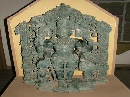 | Description / विवरण | A composite form of Shiva and Vishnu as Harihara is carved in samabhanga posture with their attributes. Two arms in broken condition. Most have had their attributes. Trident and rosary are seen in two arms while crown is a composite form, jata mukuta and kirita mukuta. At the left base, nandi is shown. At the back various form of Shiva is carved in niche in two rows. |