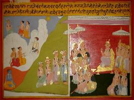 | Description / विवरण | Miniature painting based on Prithviraj Raso depicting Jaichand addressing his courtiers. At the upper left side Indra is depicted with two devotees. |