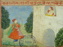 | Description / विवरण | A leaf of illustrated manuscript depicting a man talking to his lover who is standing on the window of the palatial balcony. This manuscript has 38 pages with 16 illustrations. |