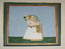 | Description / विवरण | It is a miniature painting of Maharaja Man Singh in standing pose holding a sword in his one hand and some petal shaped object is in his other hand. He is wearing a tunic of white colour and a golden colour drapery is tied around his waist. He is holding a dagger katar inside the drapery. Painting has a golden border minute detailings are present in the painting which is the speciality of miniature paintings. |