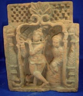 | Description / विवरण | Terracotta brick on which Radha and Krishna are carved in niche. Krishna is depicted playing flute and Radha is standing besides him. Their dresses are made with incised lines. On their each side and top some architectural designs are made. |