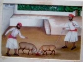 | Description / विवरण | Two people wearing white Jama and black shoes with green decoration and red and light red band and turbans are making the fight of two sambhar within an architectural ground. Trees leaves are shown in the background |