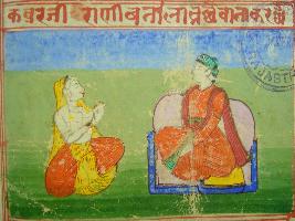 | Description / विवरण | A leaf of illustrated manuscript depicting a couple in conversation. This manuscript has 38 pages with 16 illustrations. |